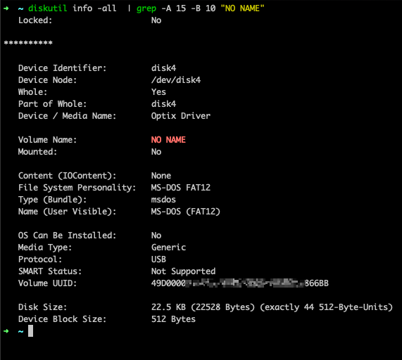 diskutil info -all | grep -A 20 -B 20 "NO NAME"